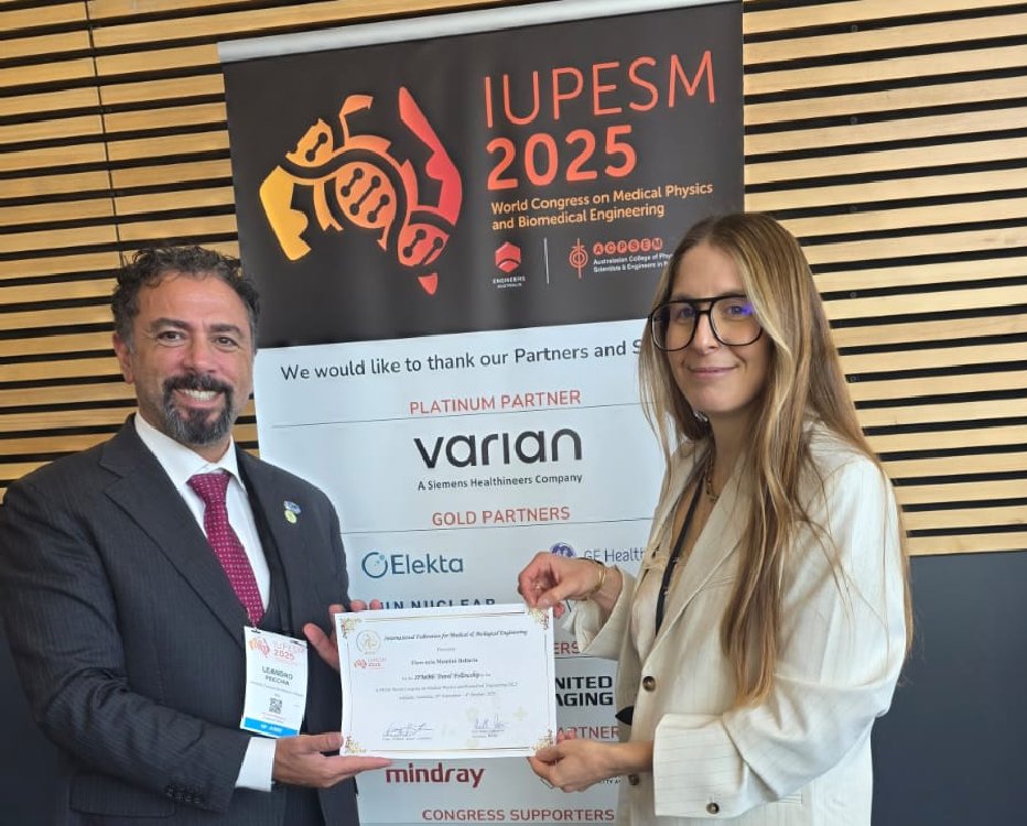 Dr. Florencia Montini Ballarin received an “IFMBE Students and Early Career Researchers WC2025 Travel Fellowship” to attend the IUPESM World Congress on Medical Physics and Biomedical Engineering 2025, held from September 29 to October 4 in Adelaide, Australia. During the Biomaterials and Tissue Engineering session, she presented a talk titled “Inspired by Nature: Design, Optimization, and Development of Biomimetic Scaffolds for Tissue Engineering.”